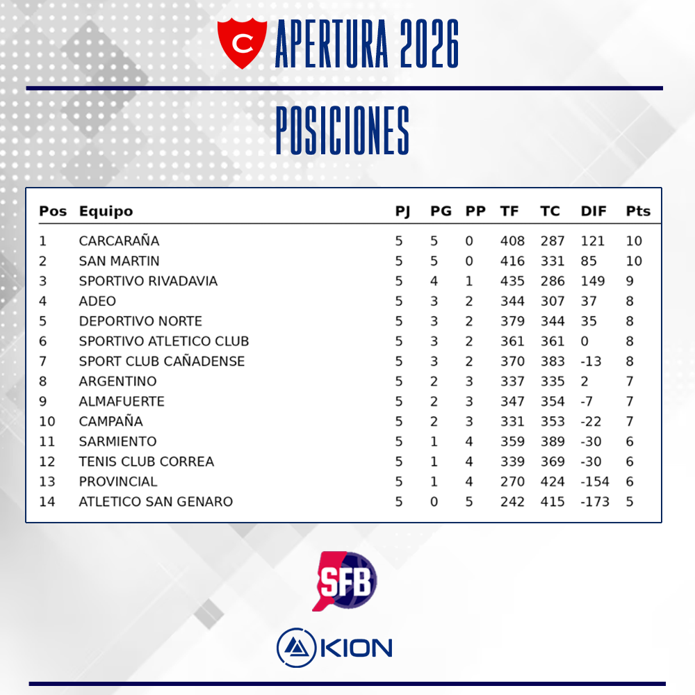 Atlético Carcarañá también mantiene su marcha perfecta tras vencer a Atlético San Genaro por 90 : 52, con Ramiro Mielejzuck como figura con 21 puntos, acompañado por Mauro Morales con 14; en la visita se destacó Gastón Martínez con 14.