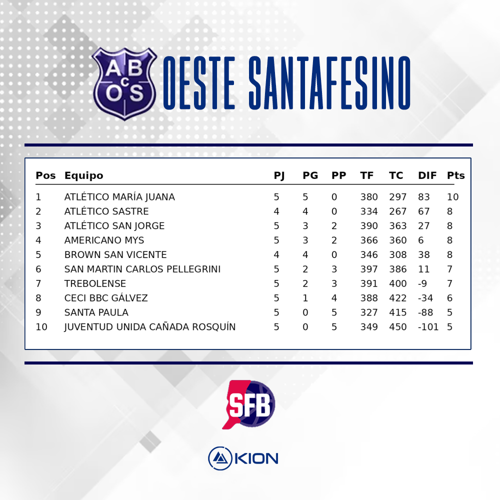 En otros de los duelos de este cierre de fecha, Atlético María Juana derrotó con autoridad a Atlético San Jorge por 72 : 55 y mantiene su invicto para seguir en la cima. El “chupa” quebró el partido en el tercer cuarto con un parcial determinante y luego administró la ventaja hasta el cierre.
