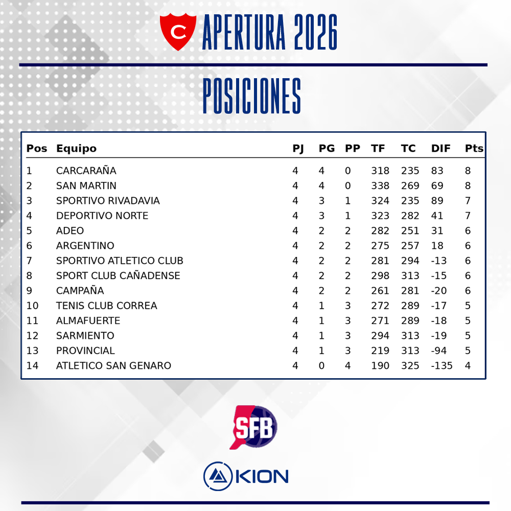 Con estos resultados, Carcarañá y San Martín lideran con récord ideal (4-0), seguidos por Sportivo Rivadavia y Deportivo Norte (3-1).