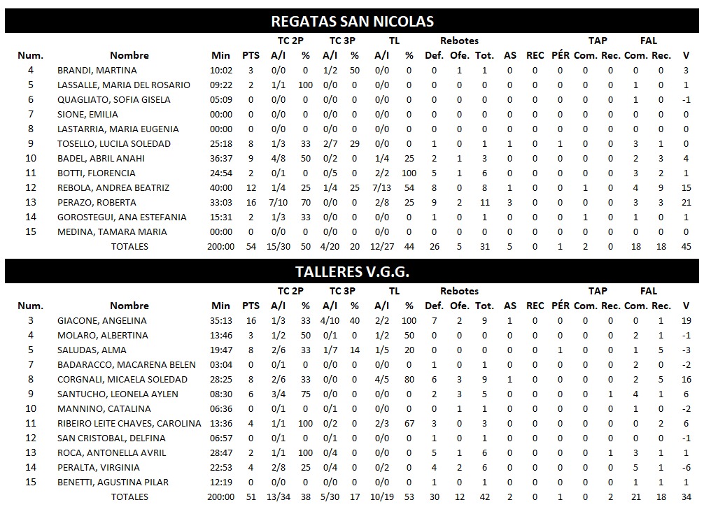 Este duelo entre el líder Talleres y el escolta Regatas favoreció a las nicoleñas que lograron así igualar la línea de la primera colocación con este noveno triunfo consecutivo . Las dirigidas por Jorge Acosta vencieron por 54 : 51 y se desquitaron de la derrota de la primera fecha cuando la T había superado 67 : 59 allá por fines de Junio.