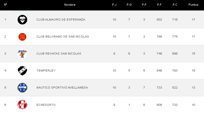 BELGRANO de San Nicolás (87): Ríos 11 , Alimena 15, Lallana 19, Araudo 14, Caraballo 14, J. Viale 6, Fenley 0, López 4, Ferrer 0, S. Viale 3.- DT: Daniel Maffei.-
