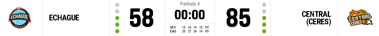 Central de Ceres prolongó su momento arrollador, quedó claramente visible en su choque con Echague. Fue victoria auirnegra 58:85 frente a los paranaenses. Matías Martinez se despachó con 28 para el equipo de Lancelotti donde «Pipi» Torne alcanzó los 12 puntos y 7 rebotes, Jorge Banegas también con similar registro. El cañadense Lisandro Fernández no fue de la partida. Mati Stival 3 puntos en el elenco perdedor.