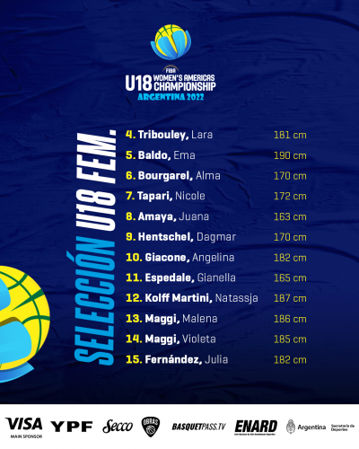 La elegidas por la entrenadora Sandra Pavón son: Juana Amaya, Ema Baldo, Alma Bourgarel, Gianella Espedale, Julia Fernández, Angelina Giacone, Dagmar Hentschel, Natassja Kolff, Malena Maggi, Violeta Maggi, Nicole Tapari y Lara Tribouley. El dato a tener en cuenta es el promedio de altura que tendrá Argentina en el certamen, con una importante media de 1.78 metros.