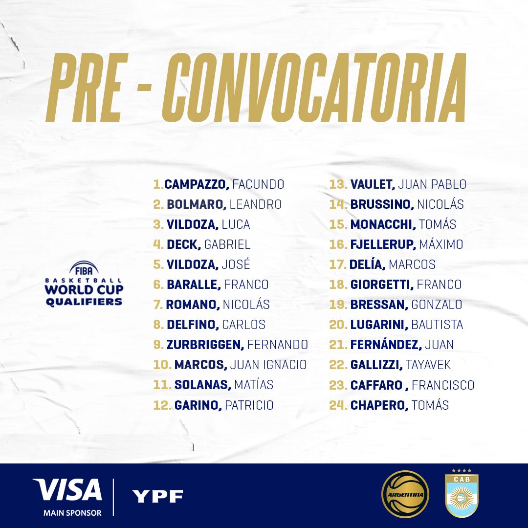 Con vistas a la tercera ventana clasificatoria para el Mundial FIBA 2023, Argentina dio a conocer una lista de 24 jugadores que serán potencialmente elegibles para los próximos compromisos de la Selección. Sabiendo que el próximo destino de la Mayor apunta a la doble fecha que jugará de visitante en Venezuela y Panamá, la nómina enmarca aquellos nombres que están dentro del radar y que a posterior podrían conformar el equipo nacional que representará al país en los venideros encuentros.