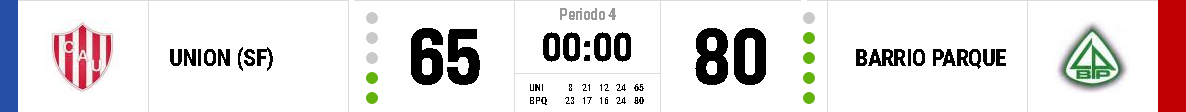 Con un gran primer cuarto y un sólido trabajo en el resto del juego, Barrio Parque le ganó a este domingo a Unión de Santa Fe por 80 a 65, en la última jornada de la sede Rosario de la zona norte de la Liga Argentina de Básquetbol.