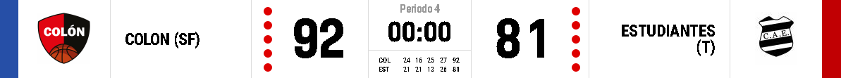 Colón (92): Ríos 16, Carnovale 29, Fernández 12, Brodsky 0, Bombino 12, Gutiérrez 12, Duarte 2, Dentis 9 y San Martín 0 DT: R. De Cecco.