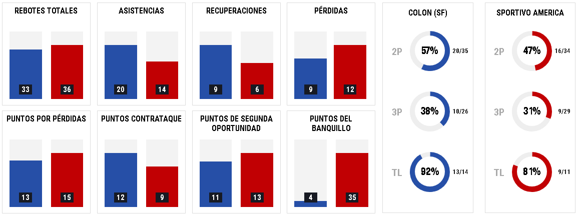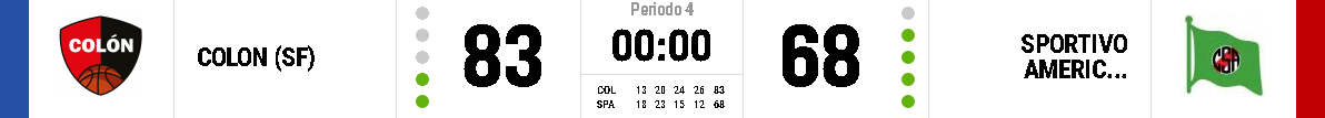 (83) – COLÓN de Santa Fe : Ríos 21, Carnovale 22, Ramos 7, Fernández 16, Gutiérrez 13 (fi) García 0, Brodsky 0, Duarte 4, Duran 0. – DT : Diego Tuosto.-