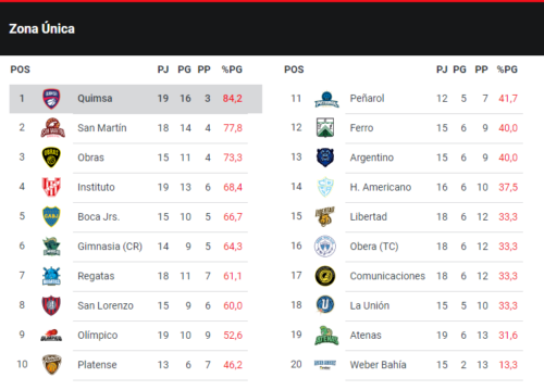 Las posiciones lo encuentran a Quimsa como lider, seguido de San Martín y Obras.