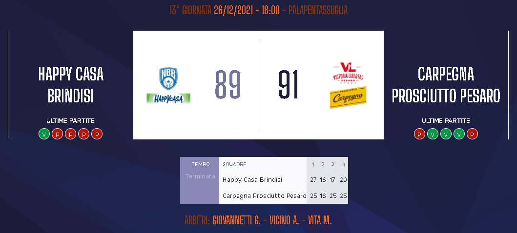 En el triunfo visitante del Carpegna Prosciutto Pesaro ante Happy Casa Brindisi 89:91 por la apertura de la 13° jornada de Lega A, el «Lancha» Delfino en 28′ hizo una planilla de 8 puntos, 2 rebotes y 3 asistencias en el ganador. Fue la 5ta victoria en 13 partidos (5-8)
