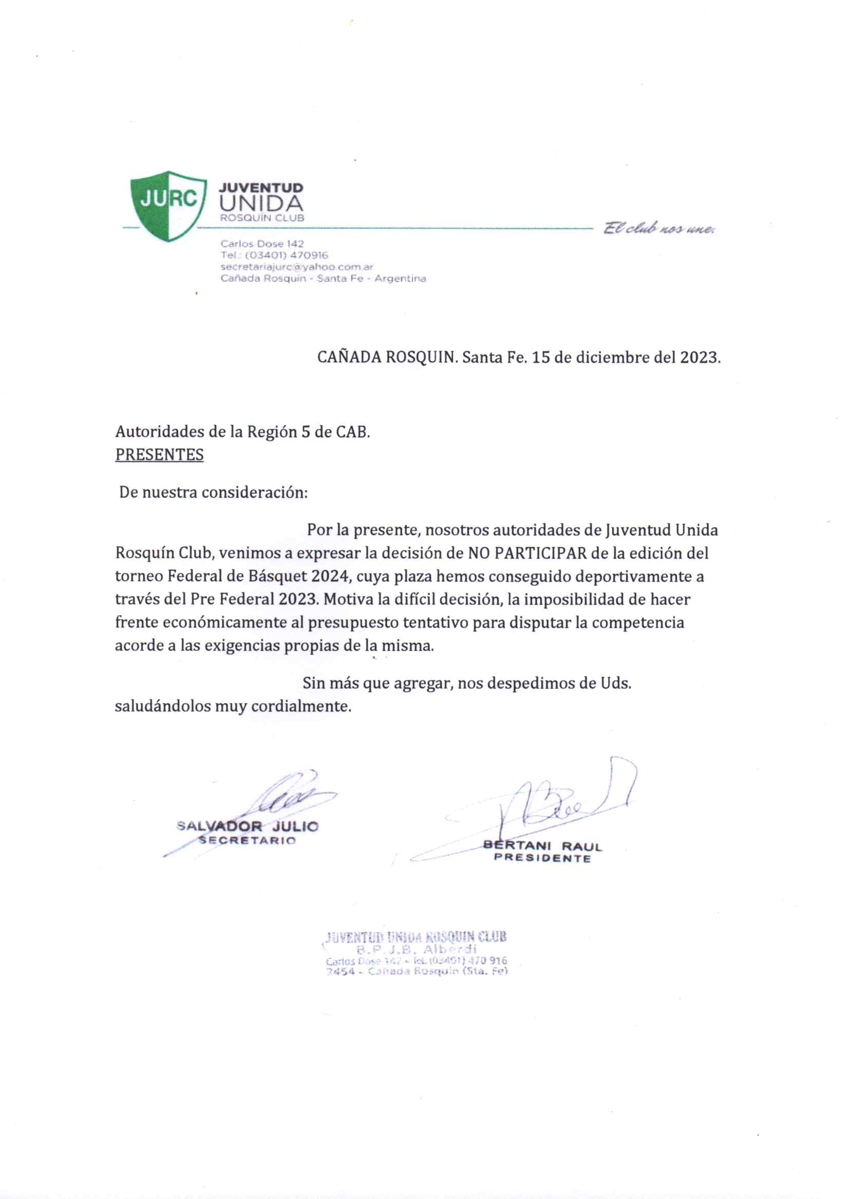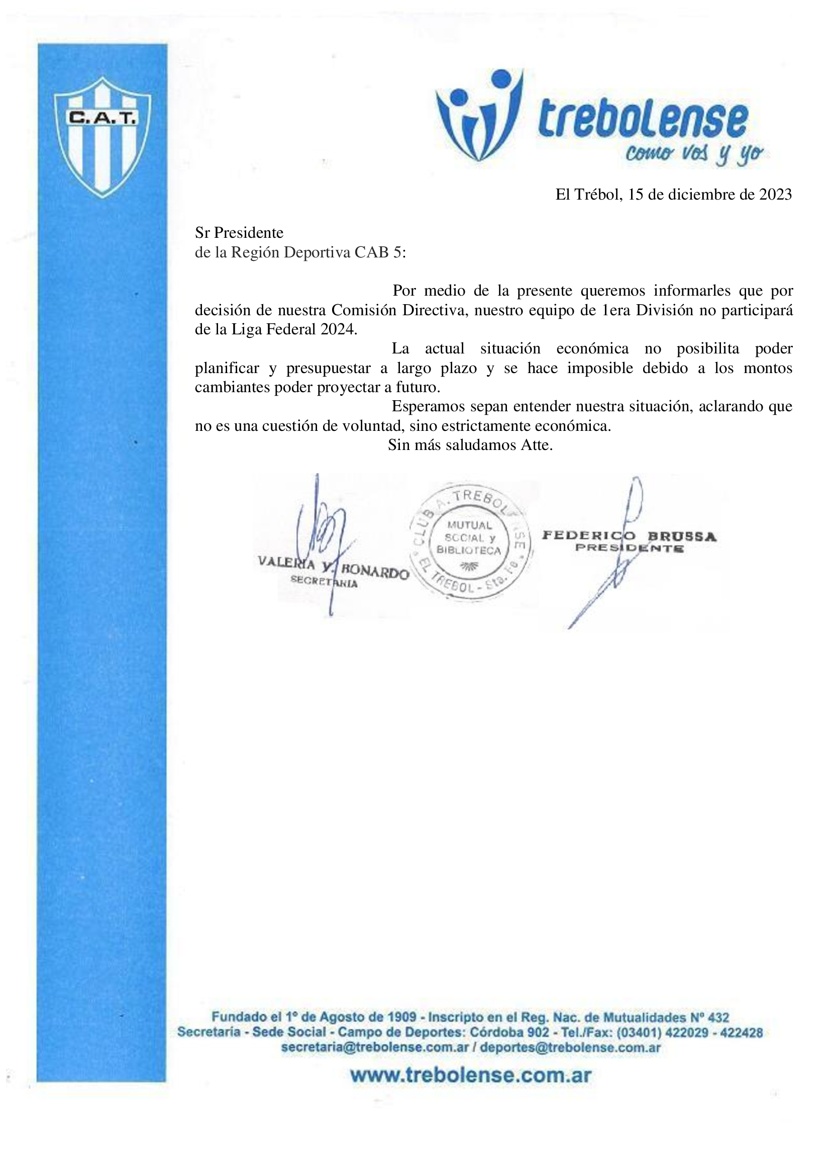 Trebolense y Juventud Unida de Cañada Rosquín le informaron a la RDCAB 5 que no jugarán la Liga Federal 2024