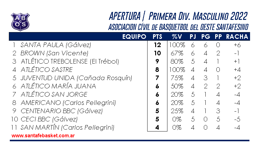 SANTA PAULA de Gálvez (104): Lautaro Delucchi 9, Tomás Vico 20, Gino Mainardi 13, Romeo Amprimo 7, Tomás Vottero 12 (fi), Jeremías Spigare 3, Manuel Vottero 10, Gino Balbo 7, Franco Graciano 12, Ismael Amprimo 11. – DT: Luis Blanc.