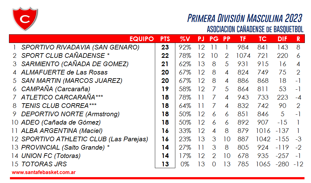 SPORTIVO RIVADAVIA de San Genaro (80): Merlo 6, Martinez, Paglietta 17, Mendía 16, Zuccalli 17, Calligaris 24. – DT: Gonzalo Bogado.-