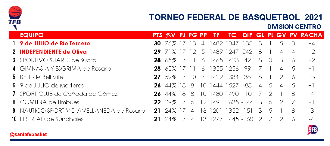 En calidad de visitante 9 de Julio de Morteros logró ganarle a Sport Club por un ajustado 73-75 en la última presentación de ambos en esta edición del Torneo Federal Con este triunfo del Nueve, la séptima colocación de la División Centro será para los morterenses que prevalecieron en el desempate frente a Sport al haber vencido en los dos duelos entre ellos.