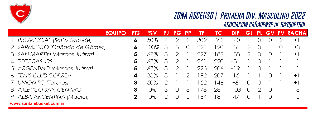 ATLÉTICO SAN GENARO (54): Intelangelo 4, Zumofen 5, Oviedo 2, Genero G 10, Piovan 2, Herrera 1, Rossi 1, Genero C, Basualdo 3, Genero M 25. – DT: Jesus Páez.-