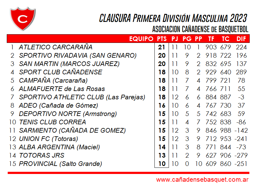 SARMIENTO (75) : Truant 0, J.De la Fuente 2, B. Beltramo 9, Carass0 18, Pirani 26, Beltrano 2, L.De la Fuente 6, Alegro 12 (x) – DT: Marcelo De La Fuente.-