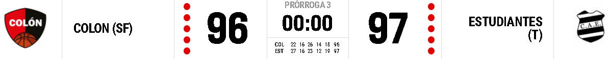 COLÓN de Santa Fe y ESTUDIANTES de Tucumán protagonizaron un encuentro electrizante que finalmente favoreció a La Cebra tucumana por 96 : 97 . El partido se definió en tres tiempos suplementarios tras igualades en 78, 85 y 92.