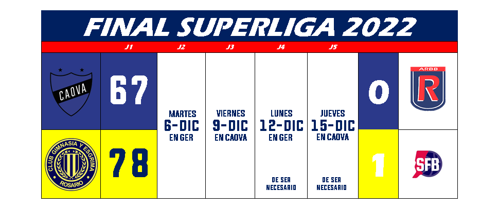 CAOVA y Gimnasia jugaron el primer partido de la serie final de la Súperliga Rosarina temporada 2022. El triunfo fue para los mensanas 67:78