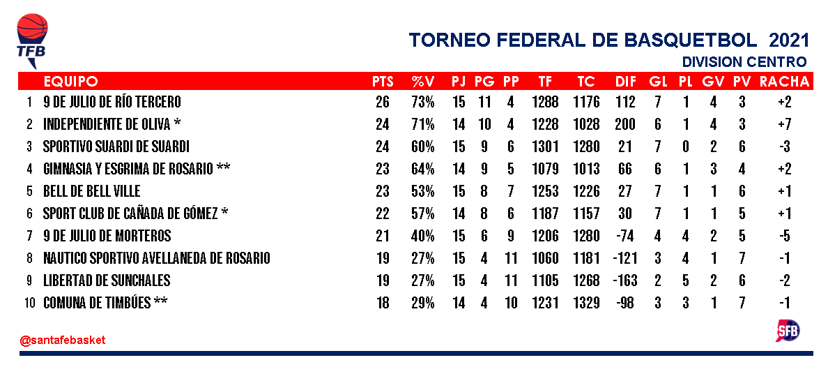 Además el lider 9 de Julio de Río Tercero matemáticamente clasificado superó a Libertad de Sunchales por otro resultado abultado de 98-69. Octavio Maretto con 22 y Mateo Pérez con 19 fueron las figuras en el elenco de Nicolás Schierano.