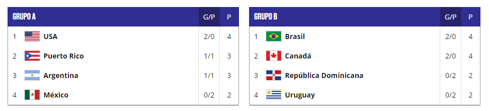 El grupo es liderado por EE.UU (2-0) seguido de Argentina (1-1) y Puerto Rico (1-1) y último está México (0-2)