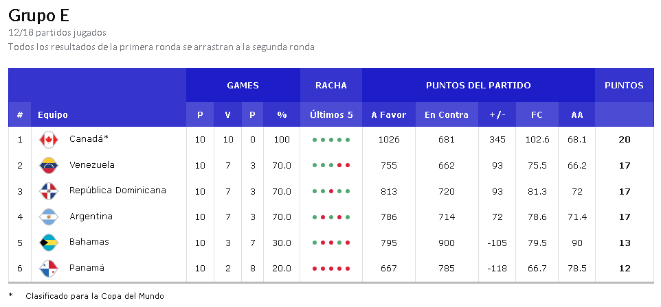 La Ventana 5 ahora está completa para Argentina y Bahamas en el Grupo E, con Argentina empatada con República Dominicana y Venezuela con 7-3. Con base en los criterios de desempate actuales, Argentina ocupa el cuarto lugar del grupo, detrás de República Dominicana y Venezuela, pero se mantienen en buena forma para eventualmente clasificarse para la Copa del Mundo en la próxima y última ventana.