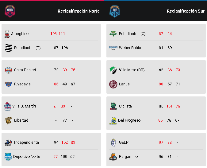 En tanto que en la Conferencia Sur, los cruces de cuartos son DEPORTIVO VIEDMA vs. GIMNASIA de La Plata, ESTUDIANTES de Olavarría vs. ESTUDIANTES de Concordia, ZARATE BASKET vs. CICLISTA de Junín y RACING de Chivilcoy vs. VILLA MITRE de Bahía Blanca.