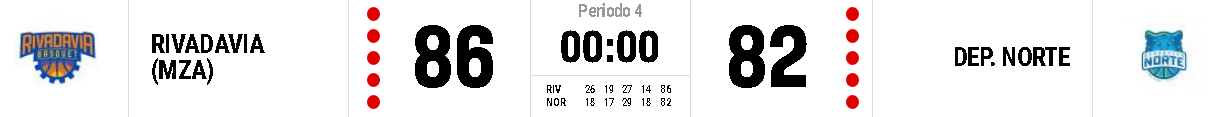 RIVADAVIA BASKET de Mendoza (86): Franco Sampaulise 16; Stefano Arancibia 6; Alejandro Madera 17; Tobías Cravero 12; Abel Trejo 16 (FI); Pablo Bandeo 13; Guido Francese 2; Khalil Adaro 1; Lautaro Cabrera 3. DT: Marcos Boccolini.-