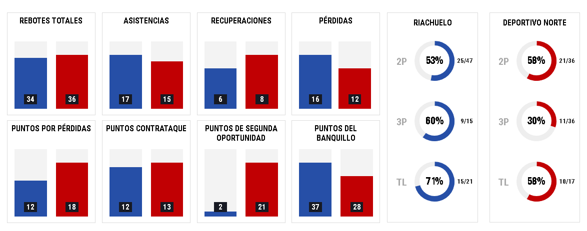 RIACHUELO de La Rioja (92): Alvarez 22, Baeza 10, Gallardo 5, Colsani 11, Gerez 7 (fi) Robinson 12, Dasso 23, Meza 2. – DT: Fabricio Salas.