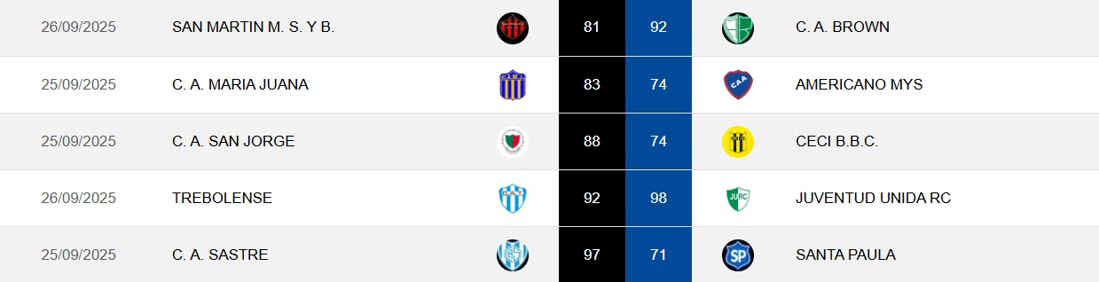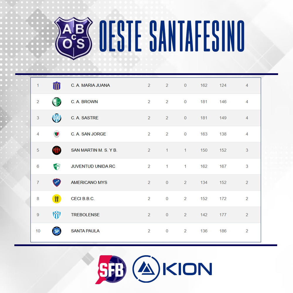 San Martín cayó en Carlos Pellegrini 81 : 92 frente a Brown de San Vicente, mientras que Juventud Unida RC logró un ajustado 98 : 92 en su visita a Trebolense. Con estos resultados, Atlético María Juana, Atlético Sastre, Brown de San Vicente y Atlético San Jorge se mantienen como líderes invictos de la segunda fase del Clausura.