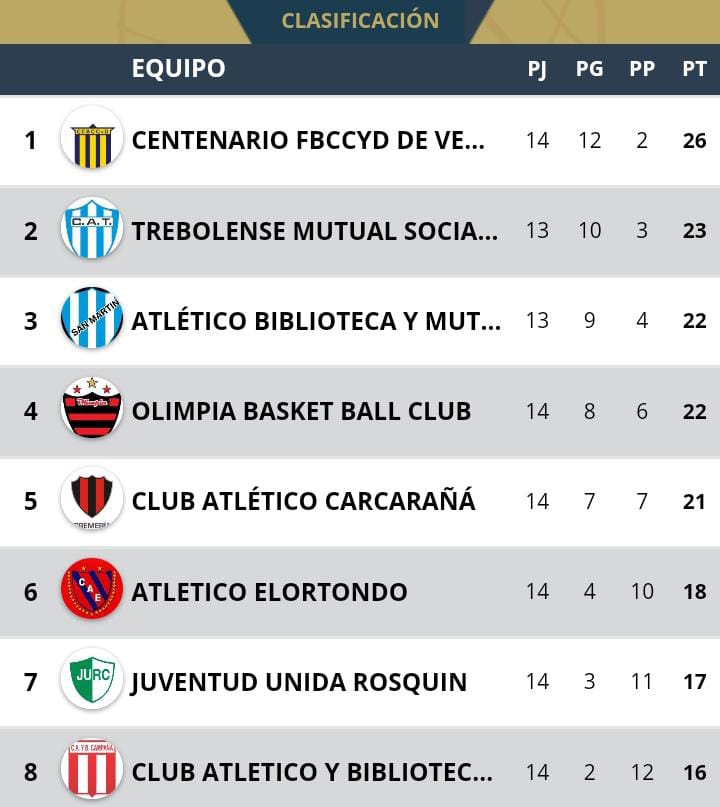 OLIMPIA de su emblemático estadio superó a JUVENTUD UNIDA de Cañada Rosquín 87 : 59 con eso le alcanzó ante la derrota de ATLÉTICO CARCARAÑA que cayó ampliamente de local 53:84 frente a CENTENARIO de Venado Tuerto.