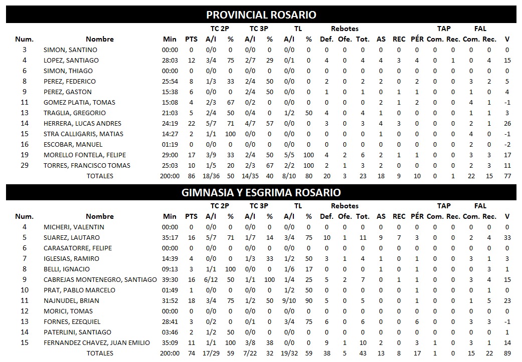 Con 22 puntos Lucas Herrera fue el máximo anotador del encuentro, Felipe Morello hizo 17 y el nicoleño Santiago López terminó con 12 . Por Gimnasia Brian Najnudel sumó 18 unidades mientras que Cabrejas y Suárez convirtieron 16 cada uno.