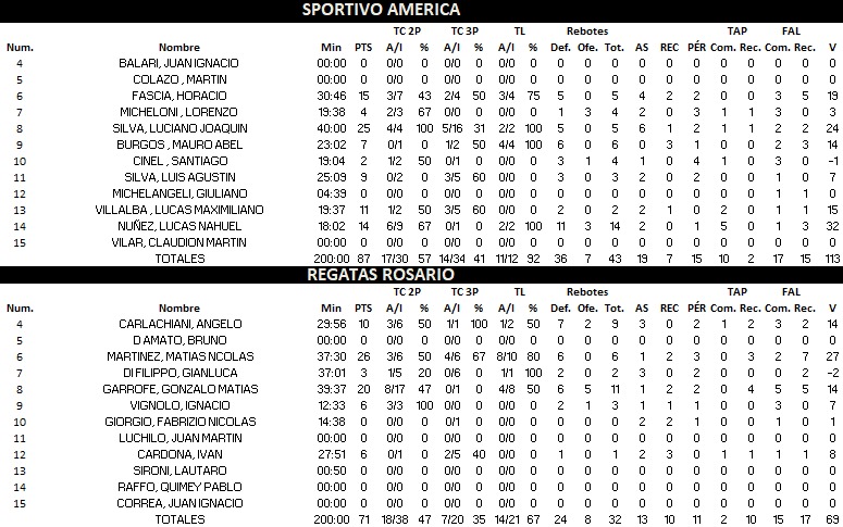 Asimismo el campeón Sportivo América derrotó a Regatas uno de los lideres de la zona 1 por 87 : 71. Luciano Silva hizo 25.