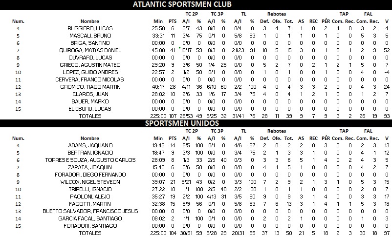 En la misma zona 2 , Atlantic dio vuelta el desarrollo para vencer a Sportsmen Unidos en suplementario 107 : 104. Matías Quiroga marcó 41 puntos.