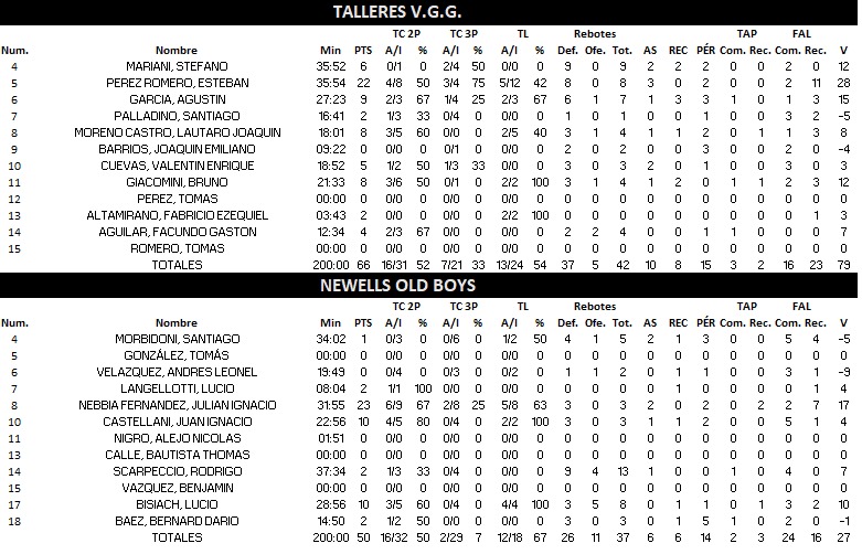 Por la zona 1 TALLERES de Villa Gobernador Gálvez en el Matías Dinsmann le ganó a NEWELLS OLD BOYS 66 : 50. El equipo de Manuel Morello consiguió un resultado que le da oxígeno en la lucha por la permanencia. A falta de cuatro fechas para la conclusión de la fase regular aventaja al club del Parque Independencia en dos partidos. Estos no ganaron en sus diez presentaciones y están sumamente comprometidos con el descenso (se van los dos últimos de cada zona)