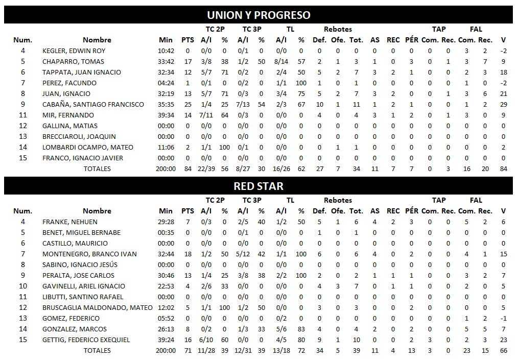 La semana de basquet en Rosario se activó en San Juan y Cafferatta. Este lunes UNION Y PROGRESO en su reducto se impuso ante RED STAR de San Lorenzo por 84 : 71 y se recompuso de la última caída frente a San Telmo de Funes.