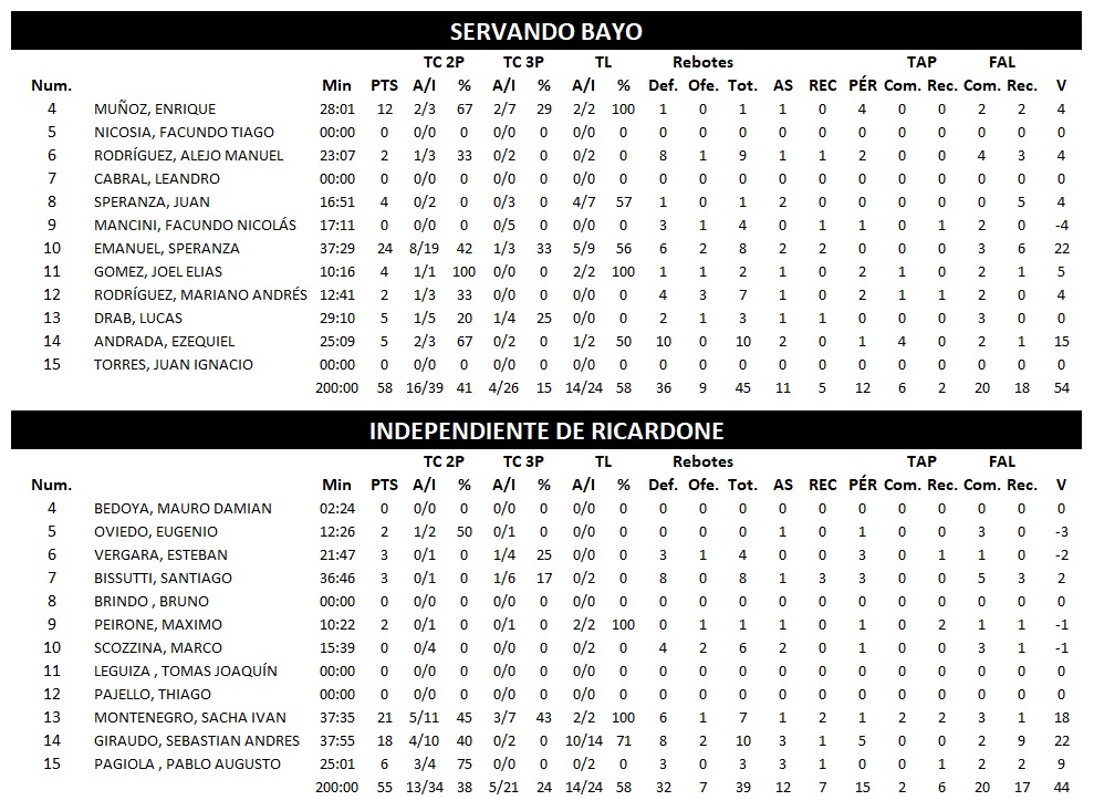Anoche en la apertura de la décima fecha de la zona 1 del certamen de Primera B , el Bayo se impuso 58 : 55 ante INDEPENDIENTE de Ricardone e igualó la línea del primer puesto de Atalaya, rival al que venció en la Fortaleza de calle San Luis Emanuel Speranza con 24 puntos fue el mayor anotador en el local , Sacha Montenegro terminó con 21 para la visita.