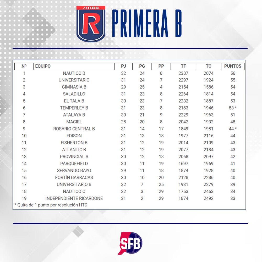Por la 31ª fecha, Fortín Barracas se impuso a Universitario B por 71 : 84, mientras que Náutico B derrotó a El Tala B 64 : 54 y se subió a la cima de las posiciones. Además, en un pendiente de la 32ª jornada, Rosario Central B venció a Náutico C 61 : 51.