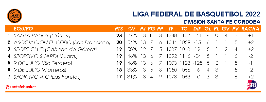 SANTA PAULA de Gálvez (101): Solari, Vottero 7, Rodriguez 17, Godoy 10, Acuña 17 (FI). Vottero 6, Ríos 33, Delucchi 6, Vico 5, Mainardi, Amprimo 3. DT: Blanc, Francisco.