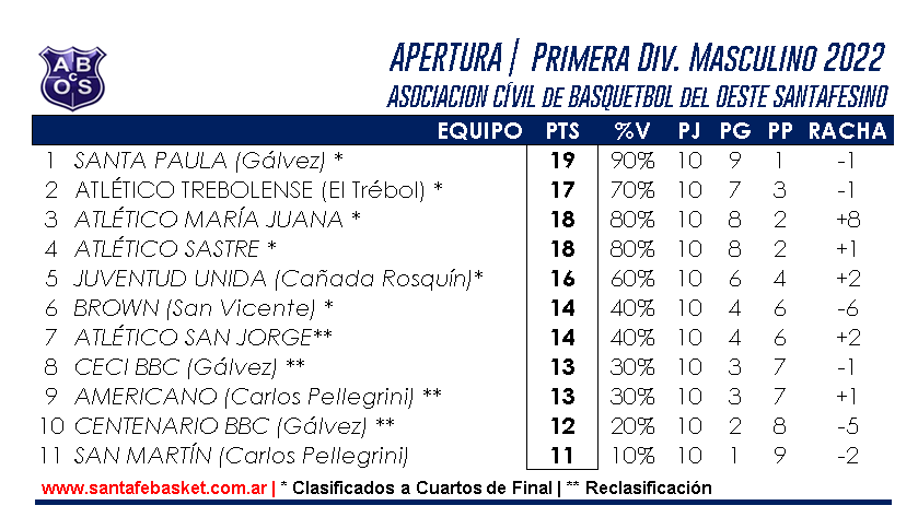 SANTA PAULA de Gálvez (66): Manuel Vottero 2, Lautaro Delucchi 5, Tomas Vico 25, Gino Mainardi 2, Tomás Vottero 16 (fi), Ismael Amprimo 16. – DT: Francisco Blanc. –