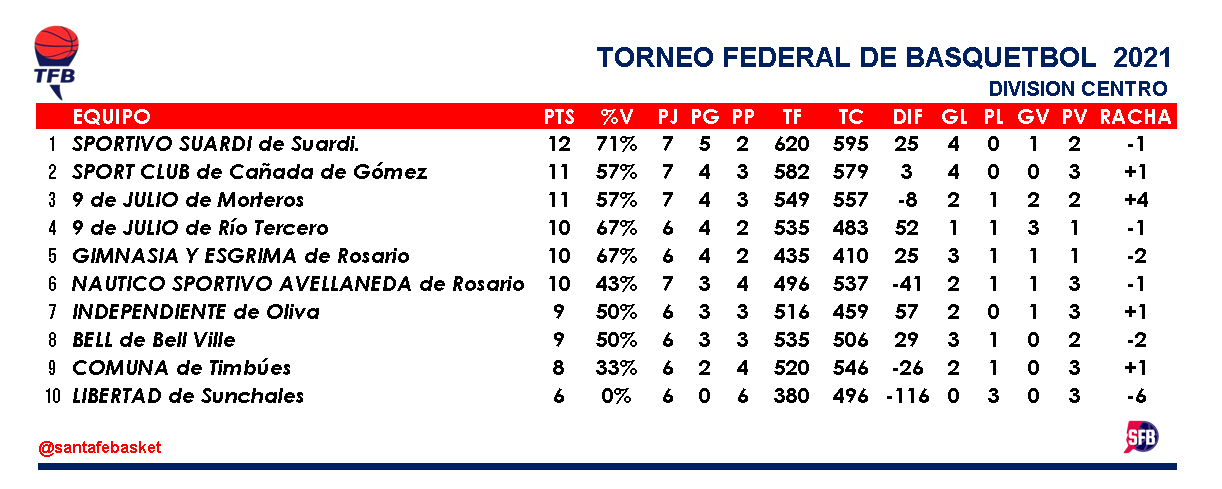 9 DE JULIO de Morteros (75): Cañete 2, García 10, Conti 9, Robledo 6, Bruera 14, Riquelme 15, Cabrera 9 y Costamagna 10. DT: GUSTAVO ROSSOTTO