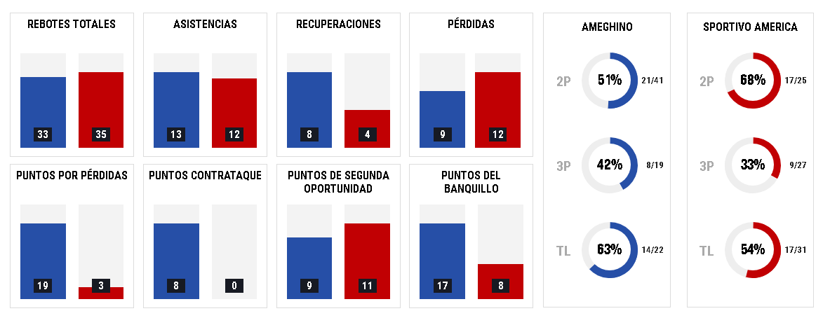 Ya en el segundo tiempo, los dos evidenciaron un tramite parejo como el que venían mostrando, acaso tuvo algo más de margen el elenco de Pablo Castro en el desarrollo global. El Verde por momentos defendió bien su aro, pero adelante no estaba tan agresivo , de hecho en toda la segunda mitad anotó lo mismo que en el primer cuarto. En el último segmento Ameghino tuvo buenas lecturas ofensivas con Abeiro y Beigier y por su parte América contrarrestaba esto con Pablo Fernández con sus características movimientos en el perímetro, la presencia de Stucky en la pintura aunque con un Cantón que ya no gravitaba extenuado por el esfuerzo de la primera mitad.