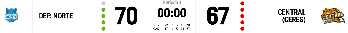 El DEPORTIVO NORTE de Armstrong dependía de sí mismo y no falló, le ganó a CENTRAL de Ceres por 70 : 67 y logró su boleto a los Playoffs. El goleador por el local pasó por Juan Pablo Lugrin autor de 13 puntos, mientras que en la visita se destacó Spalla con 12 puntos.