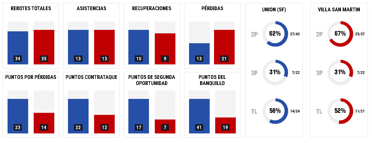 (82) – VILLA SAN MARTÍN: Vieta Fa 6, Cabrera 18, Vieta Fr 23, Picton 12, Waters 4 (fi), Fernández 7, Teichmann 12. – DT: Gastón Castro.-